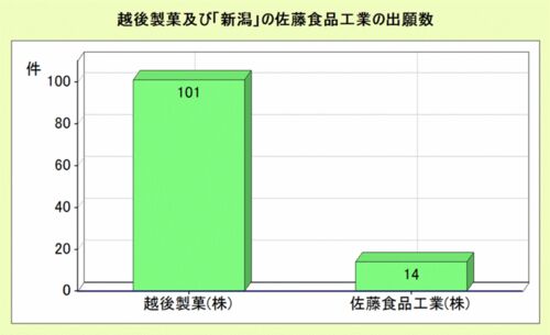 また分析に戻ってしまいますが、お付き 合いください。 まず、佐藤食品工業と、越後製菓の特許 出願数を見てみましょう。今回は、登録実用 新案出願もありそうなので、特許、実用新案の 両方で、どれくらいなのか全出願を見てみましょう。 あれー、おかしい…