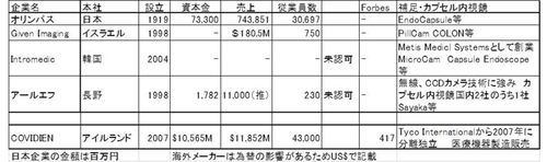 それでは、まずはまとめとして、今まで出てきた プレイヤーをまとめてみます。 Given Imagingが COVIDIENに買収されるのではないかという記事が 出て来ましたので、COVIDIENも調べてみました。 表には書かれていませんが、Given Imagiingは 日本販売で富士フ…