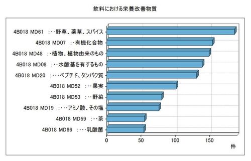 それでは、この飲料関係で研究されている 栄養改善物質は、どのようなものがあるので しょう。 さらに飲料関係を観点「MD」で調べてみま しょう。 方法は、前回同様、「4B018LB08」が 付されている出願の中から観点・栄養改善 物質(4B018MD*)も付されている…