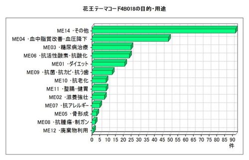 それでは、今回は、以前に分析したように テーマコード4B018について、細かく見て 行きましょう。 最初は、目的・用途(ME)ではどんな研究 がおこなわれているのか見てみます。 上記は、分析で出てきた項目すべてを表示 させています。 4B018のME14その他と…