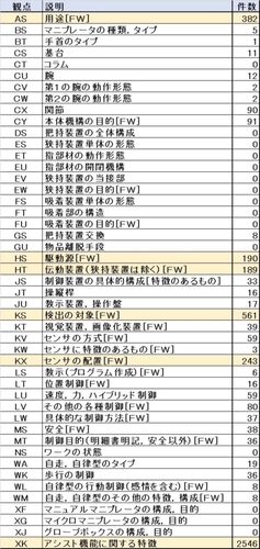 それでは、歩行補助装置について マニプレーターのFタームテーマコード 3C707で分析して行きましょう。 まずは3C707の観点がどのように 分類されているかというと、以下の ようになります。 上は、出現回数もついでに載せて あり、100件以上のものにマーキ…